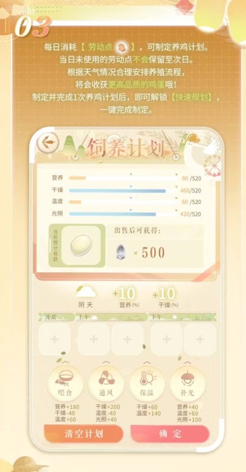 玩家需要每日消耗“劳动点”来制定养鸡计划。根据天气情况合理安排养殖流程,以获得高品质的鸡蛋。完成一次养鸡计划后,即可解锁“快速规划”功能,简化操作流程。