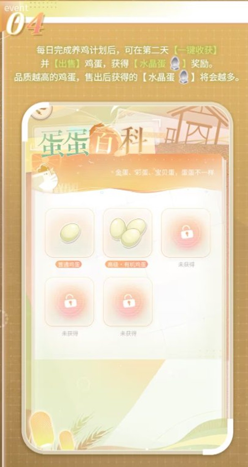 每日完成养鸡计划后,玩家可以在第二天一键收获并出售鸡蛋,获得“水晶蛋”奖励。鸡蛋品质越高,获得的“水晶蛋”奖励越多。