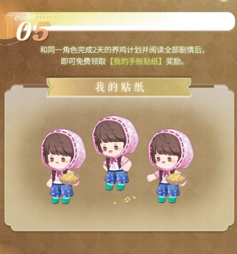 与同一角色完成2天的养鸡计划并阅读全部剧情后,玩家可以免费领取“我的手账贴纸”奖励。使用“水晶蛋”还可以在“乡里杂货摊”兑换更多纪念奖励,包括角色专属手账贴纸和活动主题通用手账贴纸。
