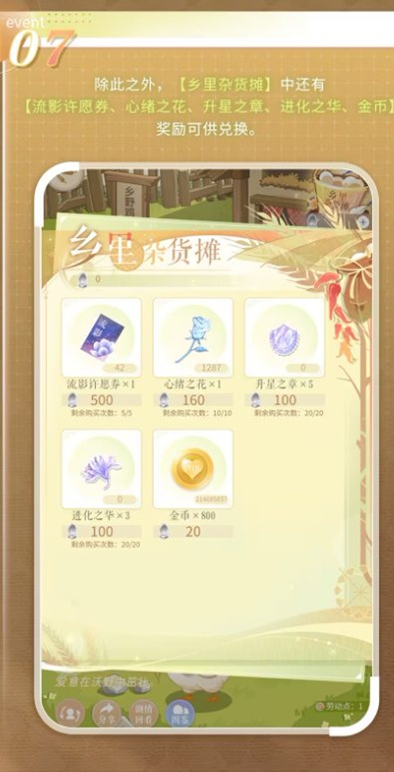 “乡里杂货摊”提供多种奖励兑换,包括流影许愿券、心绪之花、升星之章、进化之华和金币等。玩家可以使用“水晶蛋”兑换这些奖励,丰富游戏体验。