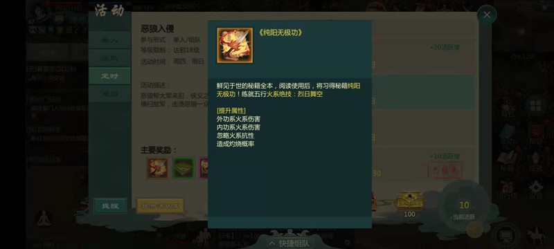 饿狼入侵活动可以指定获得一本高级秘籍,各门派掉落的秘籍属性各不相同。炎帝宝藏在每周四、日开放,是单人参与的混战活动。获得秘籍后,还需要使用奇珍阁获取的精心书卷来提升心法等级,逐步培养才能最终获得秘籍真迹。