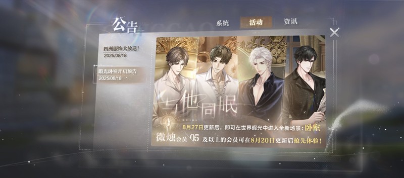 1.8月20日更新后,玩家登录游戏,即可领取【世界暇光】卧室专属穿着:【岁月缱绻】限定居家服。【微烛会员05】及以上的会员可抢先体验【世界暇光】全新场景:卧室。【夜色时光】系列服饰也将支持书房/卧室双场景穿着。