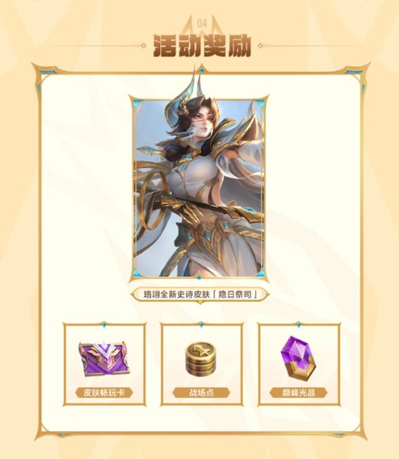在活动期间,玩家通过完成特定任务即可获得「隐日印」。累计获得一定数量的「隐日印」,即可兑换包括「皮肤畅玩卡」、「战场点」*4000、「巅峰光晶」*500以及珞翊全新史诗皮肤「隐日祭司」在内的丰厚奖励。