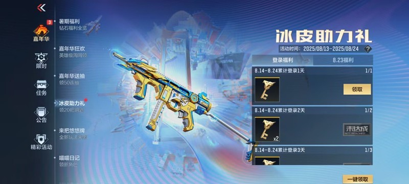 HELLO,各位看官大家好,欢迎来到本期的活动速递。听说M12S-雷霆王者-冰霜奇迹皮肤即将于8月16日上线英雄之钥兑换。细心的小伙伴已经发现,近期在嘉年华活动板块上线了“冰皮助力礼”活动,完成简单的任务即可领取20把英雄之钥。想来这一活动便是助力你拿下新皮肤,一起来看看活动详情吧~