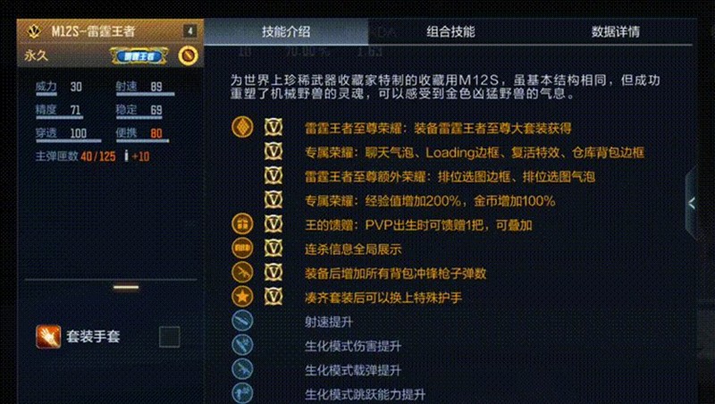 生化模式中,该武器还拥有伤害提升、载弹量增加以及跳跃能力强化等加成,特别适合生化跑酷玩家使用。M12S-雷霆王者在套装效果下,射击精度和射速进一步提升,弹道更加密集,近身爆发力更强。