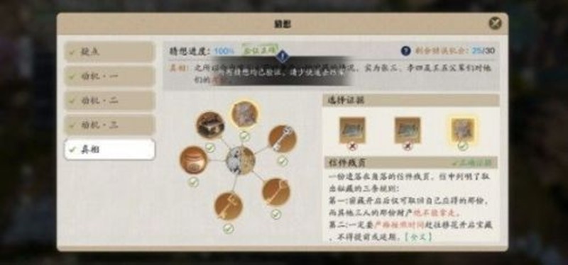 最终需要收集的证据包括方、菱、圆三种形状的物件,以及函件残页和箱子传音蛊。罪人指向父辈,这个结论需要玩家通过所有证据的串联推理得出。整个案件的剧情设计较为复杂,建议玩家仔细阅读对话内容。
