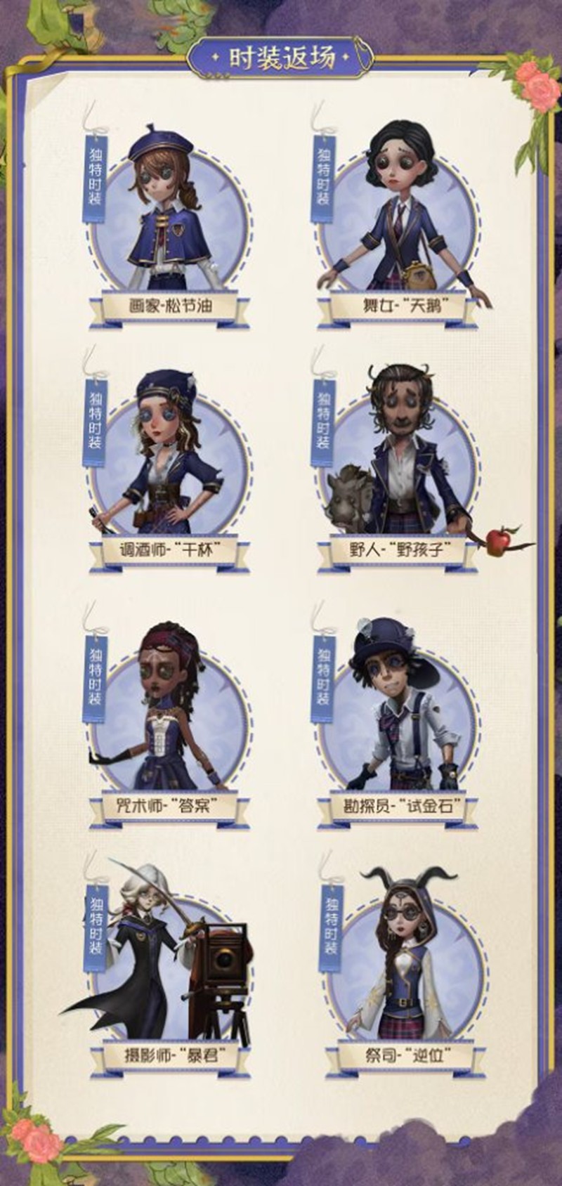 画家“松节油”、舞女“天鹅”、调酒师“干杯”、野人“野孩子”、咒术师“答案”、勘探员“试金石”、摄影师“暴君”、祭司“逆位”等角色的时装返场。