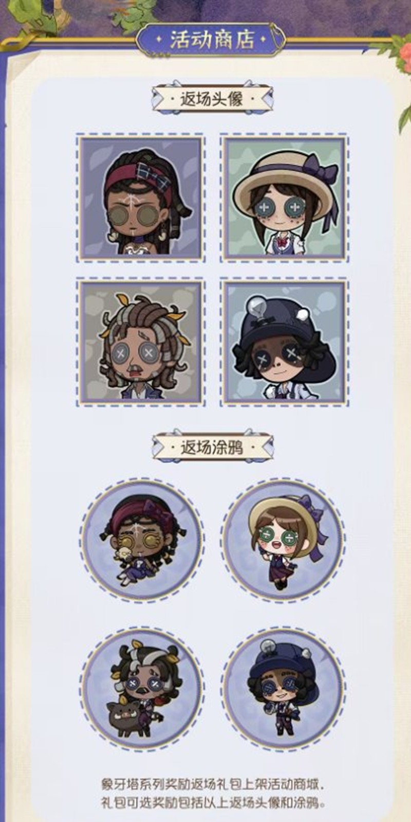 象牙塔系列奖励返场礼包上架活动商城,礼包可选奖励包括以上返场头像和涂鸦。此外,还有海报家具自选礼包,内容包括多款角色的海报。