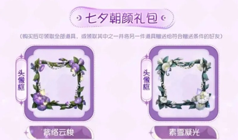 本次七夕节的头像框礼包也十分特别,推出了两款情侣款式的头像框。其中一款可以赠送给符合条件的好友,售价大约为320回声。情侣头像框的设计风格浪漫,非常适合在七夕期间使用。如果你在游戏中有特别的好友,不妨考虑购买这款礼包,为彼此留下一份独特的纪念。情侣头像框的推出也让七夕节的氛围更加浓厚,让玩家在游戏中也能感受到节日的甜蜜。