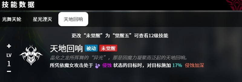 觉醒系统为吉拉蒂亚的成长提供了更多可能性。每一次觉醒都像是她的一次蜕变,使她在战斗中的表现更加出色。在1觉阶段,她的“天地回响”技能得到加强,同时饰品“纯白龙尾”的觉醒等级提升,此时龙尾提供的侵蚀强度和侵蚀命中各增加7.5%。进入2觉后,这些数值进一步提升至8.75%。3觉阶段时,侵蚀强度和命中均达到10%。4觉阶段,她的所有技能等级提升2级,龙尾的侵蚀强度和命中分别提升至11.25%。最终在5觉阶段,她的技能效果达到巅峰,龙尾的侵蚀强度和命中均提升至12.5%。