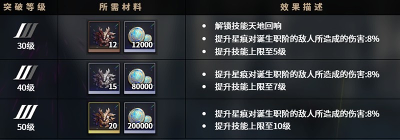 除了主动技能外,吉拉蒂亚的被动技能“天地回响”同样具有极高的战术价值。当她所凭依的魔女攻击处于侵蚀状态的目标时,会额外施加17%的侵蚀加深效果。随着角色等级的提升,这一技能会不断强化。在30级时,吉拉蒂亚解锁该技能并获得两项强化:对诞生职阶敌人造成的伤害提升8%,技能上限提升5级。在40级和50级时,该技能的伤害加成和技能上限还会进一步提升,分别达到8%和10级。因此,建议玩家至少将吉拉蒂亚培养到二觉,以确保她在后期阵容中依然具备竞争力。