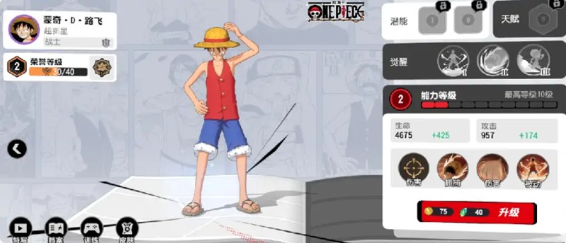 路飞的战斗方式充满自由与活力,他的普攻是一套四次连续攻击,可以在移动中进行。被动技能使他在每次造成伤害后提升移动速度,觉醒后还增强了对减速状态的免疫能力。他的小技能可以将自己像炮弹一样抓向敌人,考验玩家的预判能力。而他的大招是矩形范围的强力一击,虽然释放后会短暂变小,但爆发力依旧强劲。