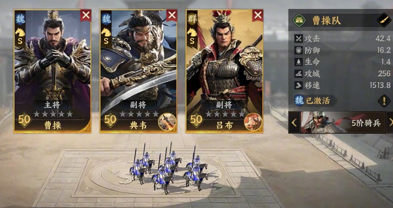 曹操队通常由曹操、典韦和吕布组成,在实战中具备较强的突击能力。曹操适合放在第一位,能为队伍中武力最高的武将(通常是吕布)提供增伤效果,同时提升骑兵的移速,便于快速突袭。典韦作为第二位输出,可以利用移速差进一步提升伤害,而吕布则适合担任收割角色,尤其在敌人数量较多时,他的大范围伤害能力能发挥出最大效果。这套阵容适合快速推进和绕后作战。
