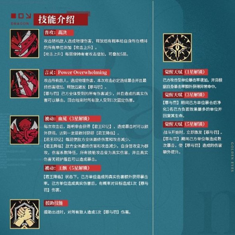 1.普攻:裁决攻击随机敌人造成物理伤害,并有概率给自身所在横排的所有单位添加攻击力上升状态。