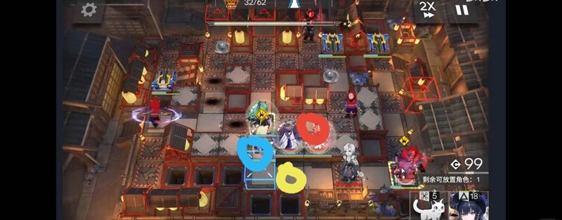 开局放先锋回费(黄圈),阻挡干员放蓝圈(黍,自回干员),蓝圈旁放输出干员(维逻新能等)