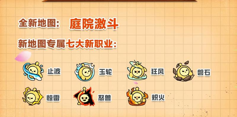 在“庭院激斗”地图中,玩家每次复活时可以从“止波”“炽火”“惊雷”“狂风”“磐石”“怒兽”“玉轮”这七大新职业中选择一个投入战斗。每个职业都拥有独特的被动效果、小技能和绝招,为玩家提供了丰富的职业选择和战斗风格。