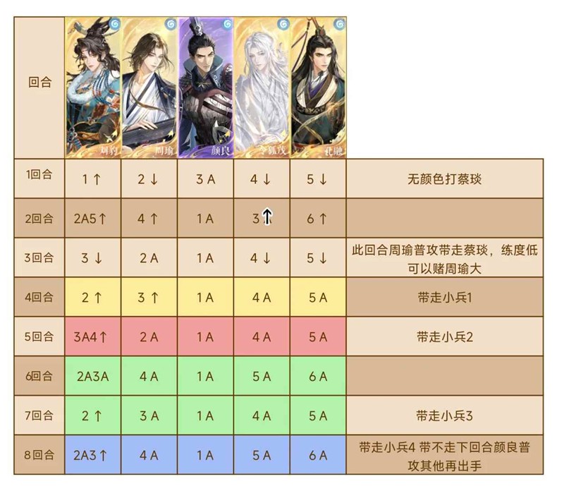 配队图2,跟打图3,这个打法是三回合打完蔡琰,四回合打完也可以,小兵的话很好打