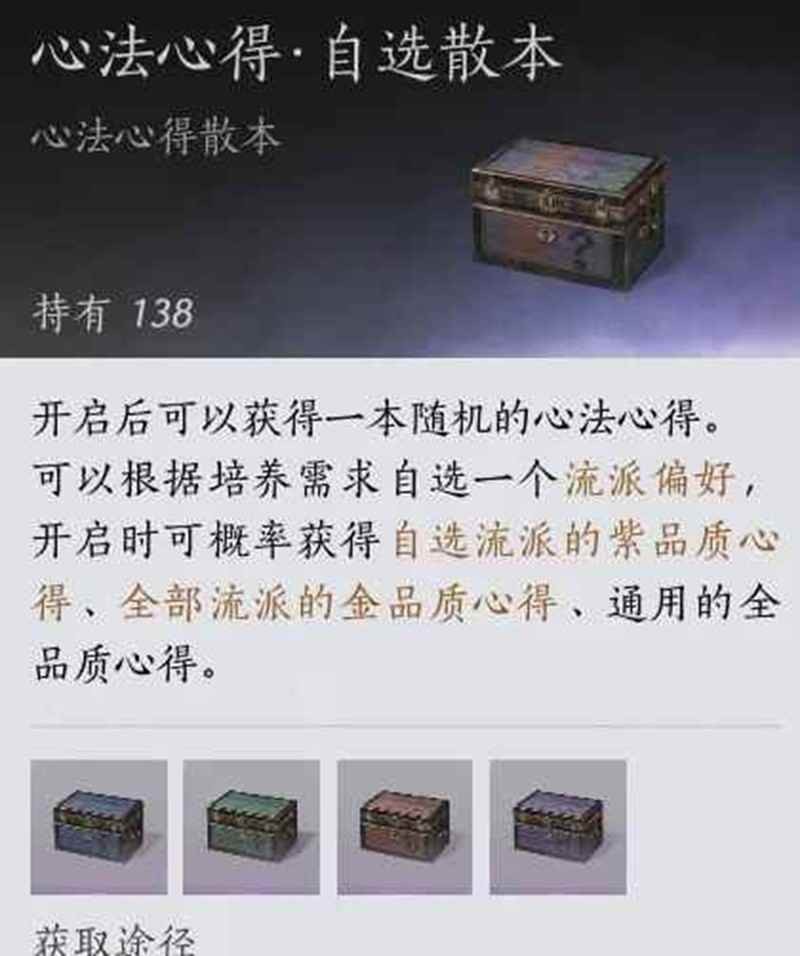 如果你已经打完了自己流派的首通,这个时候就可以把自己的流派金和流派紫转成别的流派金流派紫,打那个流派的太平武墓就可以白嫖心法了,比直接回收别的流派心法赚,但是有七天cd的副作用。
