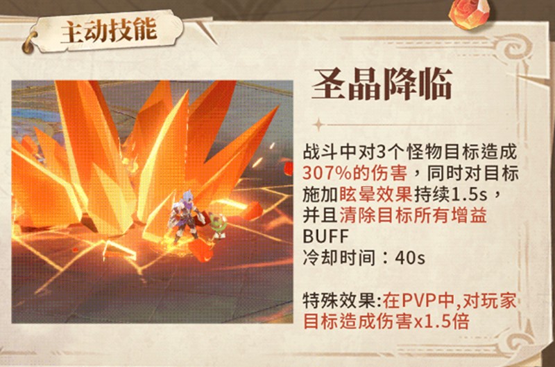 圣晶降临技能是猎风传说熔岩晶龙的主要主动技能。该技能可以对三个怪物目标造成自身攻击115%的伤害,并附加熔岩灼烧状态。这个状态每秒造成10%的攻击伤害,持续5秒时间,技能冷却时间为40秒。在对战过程中,这个技能还能额外增加50%的伤害输出。
