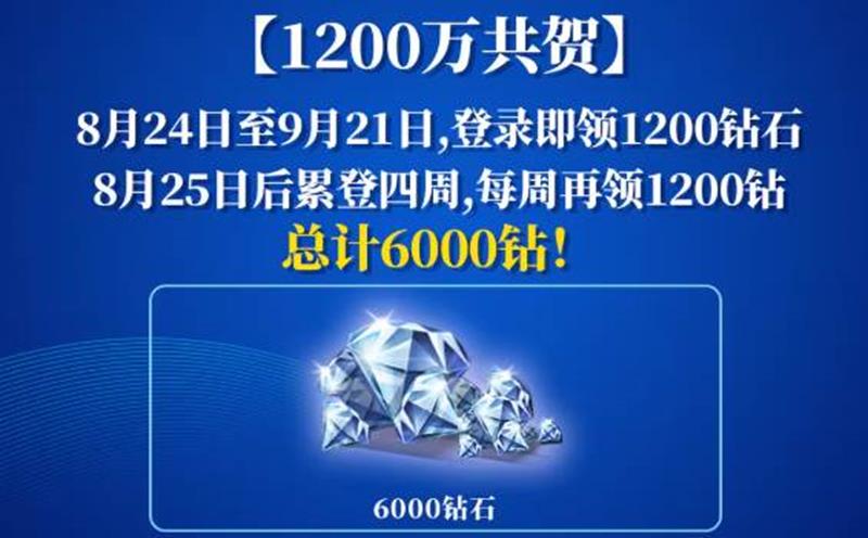 活动内容:登录即领1200钻石8月25日后累计登录四周,每周再领1200钻石总计可领取6000钻石!