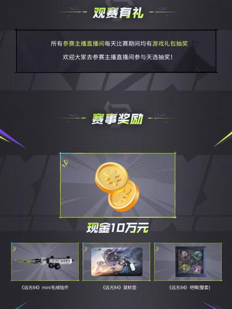所有参赛主播直播间每天比赛期间均有游戏礼包抽奖,欢迎大家去参赛主播直播间参与天选抽奖。赛事奖励丰厚,总奖金高达10万元,还包括《远光84》mini毛绒挂件、《远光84》鼠标垫、《远光84》吧唧(整套)等实物奖励。