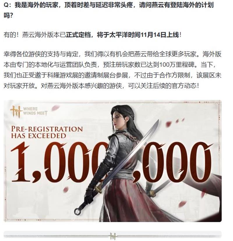 目前,《燕云十六声》国际服的预约人数已突破千万,这一数字不仅体现了游戏的高人气,也预示着其在全球市场的巨大潜力。游戏将于11月14日上线,届时玩家可以体验到这款备受瞩目的武侠开放世界游戏。感兴趣的玩家可以前往官方网站或相关平台进行预约,以获取更多游戏资讯和福利。