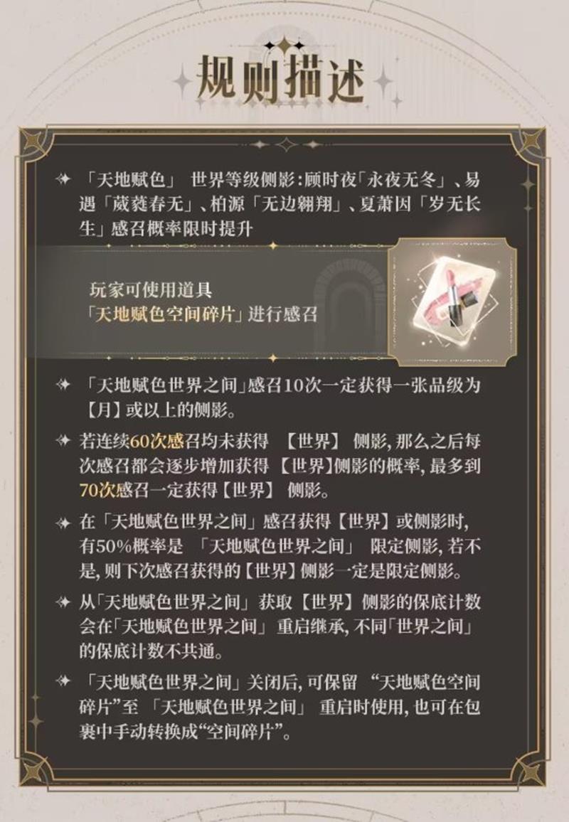 ✦在「天地赋色世界之间」感召获得【世界】侧影时,有50%概率是「天地赋色」限定侧影,若不是,则下次感召获得的【世界】侧影一定是「天地赋色」限定侧影。