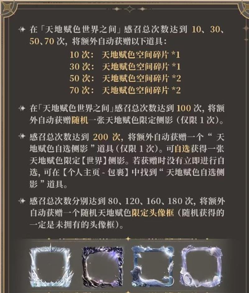 ✦感召总次数分别达到80、120、160、180次,将额外自动获赠一个随机天地赋色限定头像框(随机获得的一定是未拥有的头像框)。