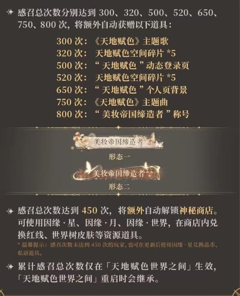 ✦在「天地赋色世界之间」感召总次数达到100次,将额外自动获赠随机一张天地赋色限定【世界】侧影(仅限1次)。