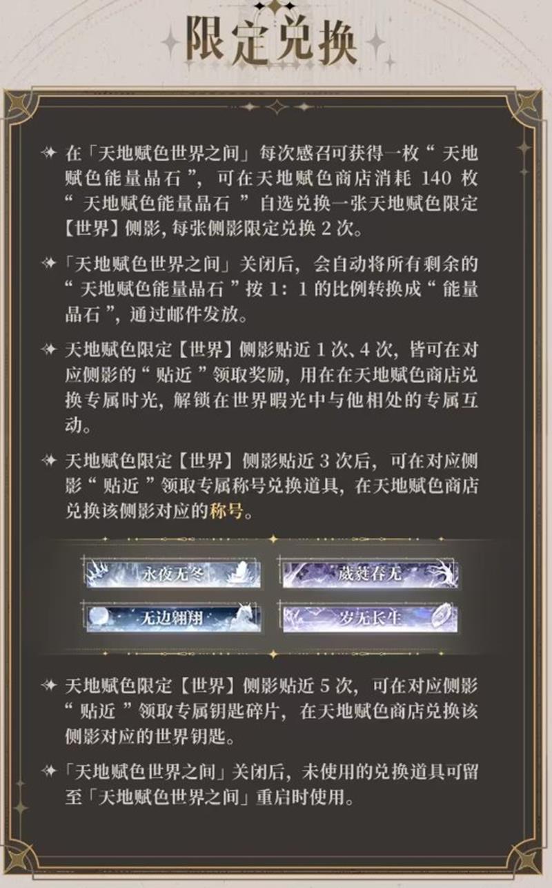 ✦天地赋色限定【世界】侧影贴近3次后,可在对应侧影“贴近”领取专属称号兑换道具,在天地赋色商店兑换该侧影对应的称号。
