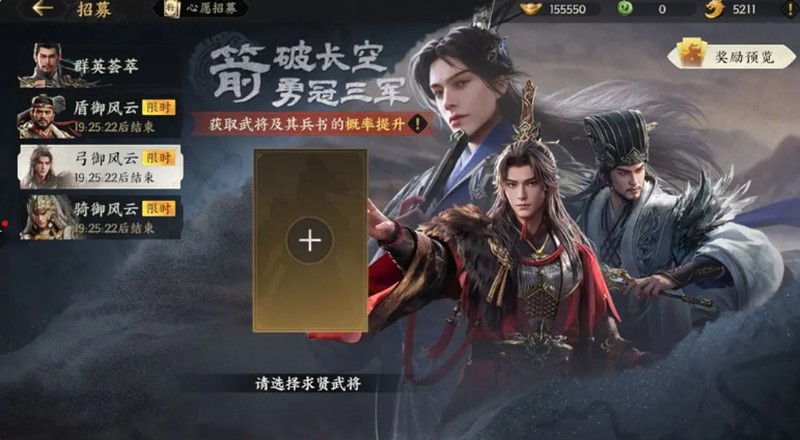 随着游戏进程推进,玩家会遇到资源瓶颈期。这时"御风云"系列定向招募卡池就显得尤为重要。这个按赛季分三轮开启的特殊卡池专注于特定兵种武将的招募,如弓兵、骑兵、盾兵等精英武将。该卡池最大的特色是心愿锁定功能,玩家可以指定心仪武将,系统会大幅提升其获取概率。