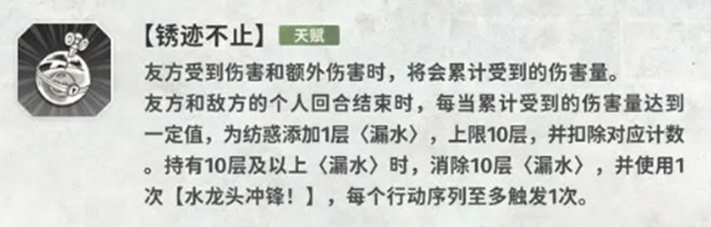 纺惑的天赋锈迹不止是她机制的核心,每当队伍中有人受到伤害时,她就会积累漏水层数,达到上限后自动释放一次水龙头冲锋。这个被动技能相当于额外的群体输出循环,让她在战斗中能够持续制造压力。