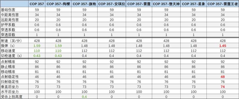 以英雄级COP 357系列武器为基础,所有普通英雄级COP 357的基础性能是一致的;而王者COP 357的性能仅仅在换弹、点射稳定性、垂直后坐力等方面略有提升,提升幅度不大。