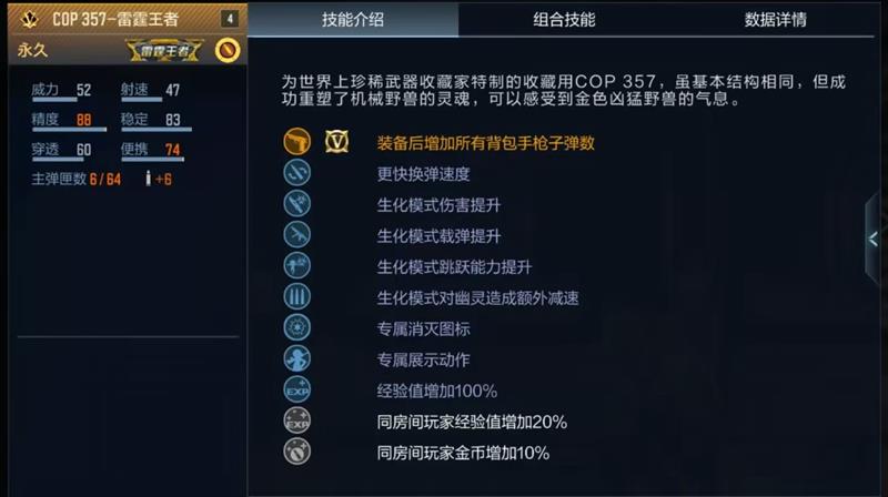 COP 357-雷霆王者不仅基础性能出色,在生化模式中也有一席之地,生化模式伤害提升、跳跃能力提升、对幽灵造成额外减速等一系列技能让COP 357-雷霆王者在生化模式中也能有很强的能力。最主要的是生化模式载弹提升,主弹匣载弹量最高可达34发,恐怖如斯~