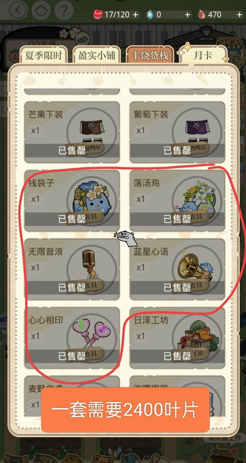 ①优先用叶片兑换一套农具(共需2400叶片)