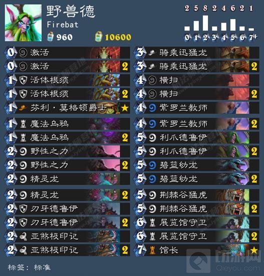 设想下2回合3个5/5的随从,而且还不是白板随从。另外Friebat还在封顶曲线加入了新牌馆长,为了触发馆长他戴上了精灵龙和碧蓝幼龙,还有芬利爵士,确保馆长最差也是一个知识古树的效果。关于野兽德有很多不同的版本,如果你有这方面的心得欢迎发给我们。