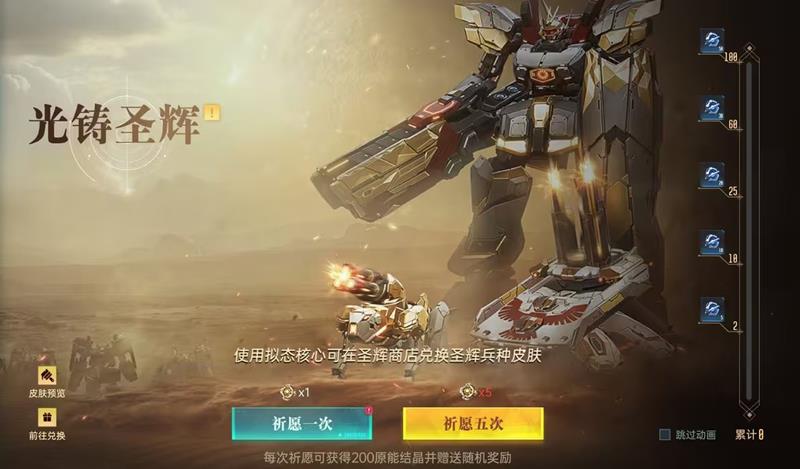 活动内抽取兑换道具“拟态核心”后在商店内兑换兵种装扮:圣辉机兵、圣辉战车、圣辉泰坦限时兑换;