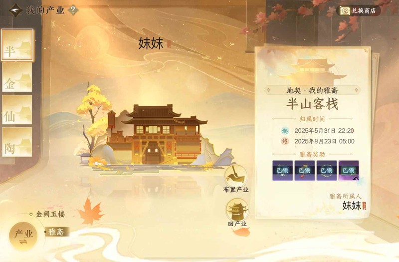 5.最推荐雅斋,因为不用做任务可以直接拿到奖励,想要换名片动作,分两次拍同一产业就可以。(比如第一次拍仙居园,到期后再拍一次仙居园,就可以直接换动作)