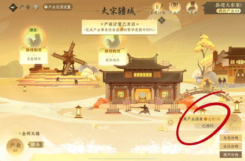 4.相同产业同一任期不能同时选择,任期结束后可以选择同一产业。(比如同时拍下两个雅斋,仙居园三条线都没有大当家,那么只有第一个可以选择仙居园,第二个无法选择仙居园,只能选择其他雅斋产业。)