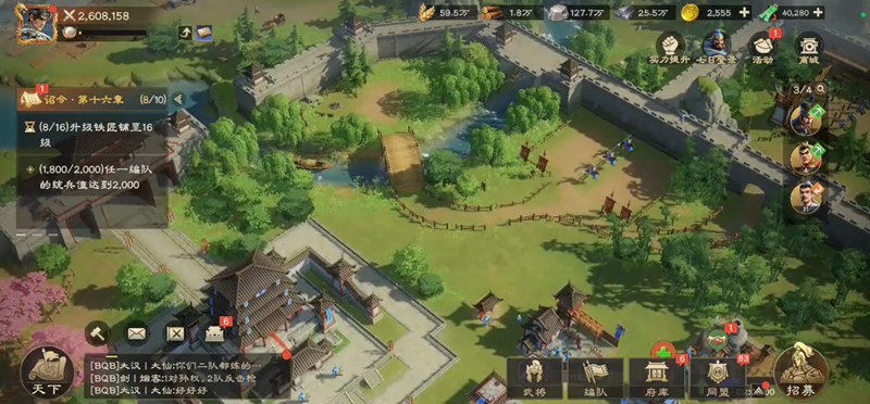 游戏初期资源获取主要依靠耕地、采石场和伐木场,新手玩家开局就能免费获得大量基础资源。使用采集令可以显著提升资源采集速度,帮助玩家快速积累发展所需的物资。每个章节任务都能带来大量金币奖励,还有机会获得珍贵的英豪令道具。