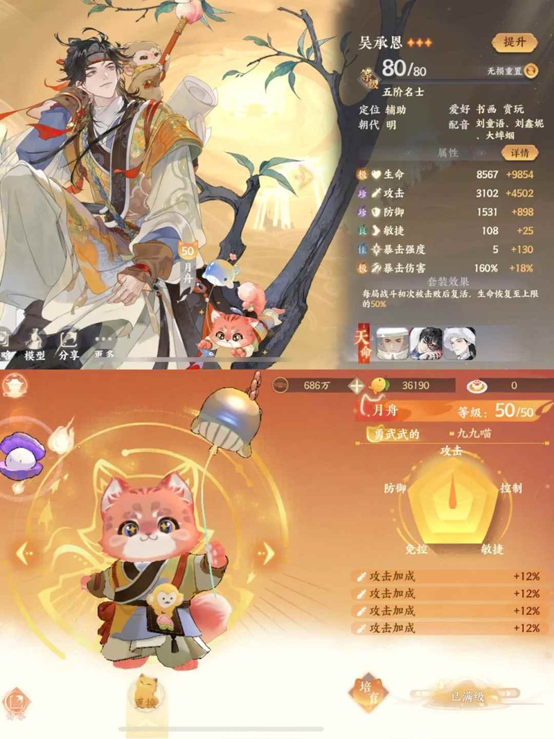 3)名士猫洗攻击加成词条,九世灵优先50级以上的金红蟹蟹,如果没有,带上一个满级的极品九世灵即可(带有减伤效果的,如赤金魂)