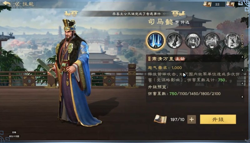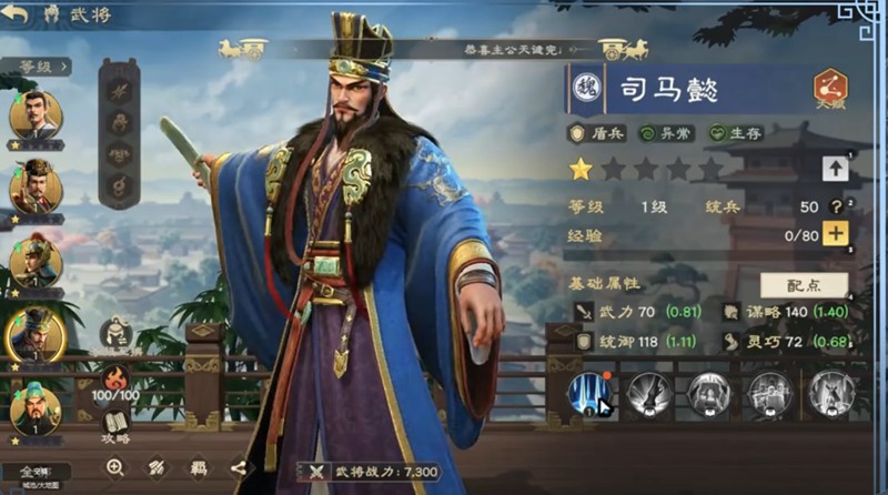司马懿的基础属性相当均衡,初始武力70、谋略140、统御118、灵巧72。他的核心技能是范围群攻,能够在指定区域内造成多次伤害。随着等级提升,伤害系数会逐步增加,解锁更多技能后,司马懿在队伍中的战术价值会更加突出。