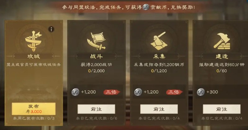 每周三次的攻城任务是加入同盟后必须参与的活动,这也是占领其他玩家城池的合理途径。在限定时间内成功攻下指定城池,不仅能获得丰厚的攻城奖励,还能获得占领城市本身的资源。战斗、采集、建造等常规任务则是日常积累贡献币的主要方式,这些虚拟货币可以在民丰坊中兑换珍贵道具。