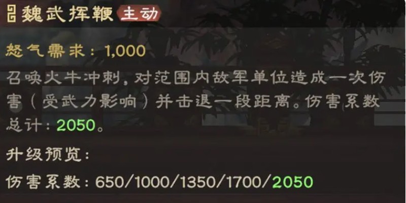曹操的怒气技能魏武挥鞭虽然伤害数值不高,但战略价值极大。这个直线冲刺技能不仅能打乱敌方阵型,其击退效果还能创造有利的输出空间。在实战中,合理运用这个技能可以将敌人逼入不利位置,配合队友形成集火优势。