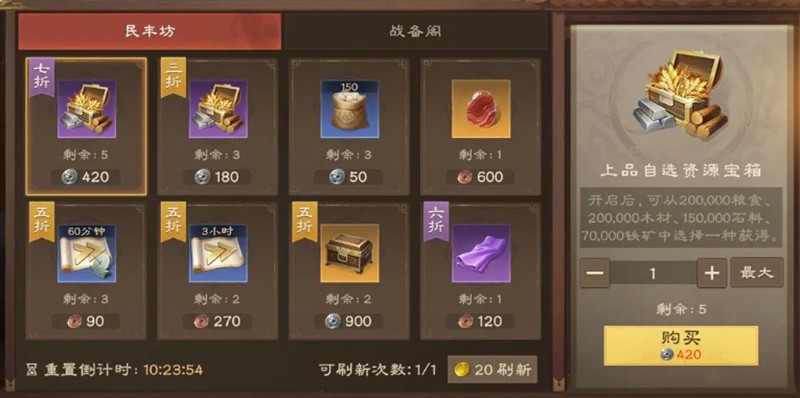 商业系统中的民丰坊和战备阁为资源管理提供了更多选择。玩家可以用贡献币兑换稀缺资源,或将战场功勋转化为战略物资。特别是3折宝箱的出现,往往是解决资源短缺的关键。