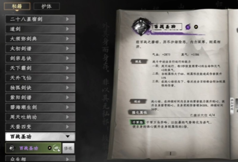 天下霸剑与千川惊鸿是刀剑流的核心心法,能显著提升刀剑类武器的攻击力和技能伤害。配合万法神罗可以进一步放大输出能力,再加入心剑诀与伤剑诀则能强化招式衔接和命中率,同时通过回血效果弥补战斗中的血量消耗。