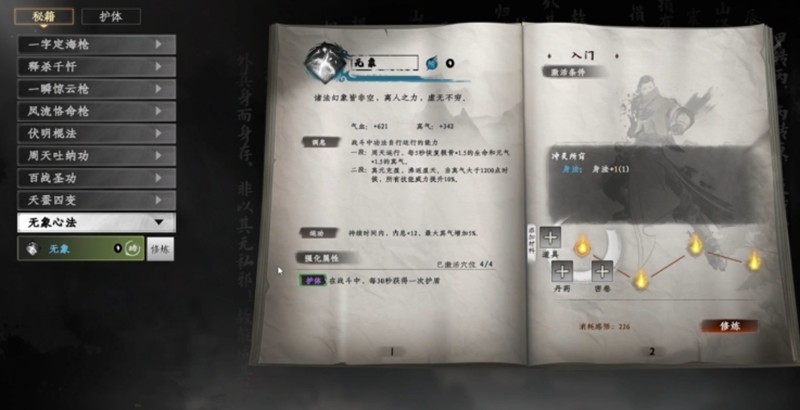 四象无极心法提供了减伤和负面效果免疫能力,是生存流的基础。加入扶摇九天和灵犀渡念后,闪避率和移动速度得到提升,帮助玩家规避伤害并灵活调整站位。