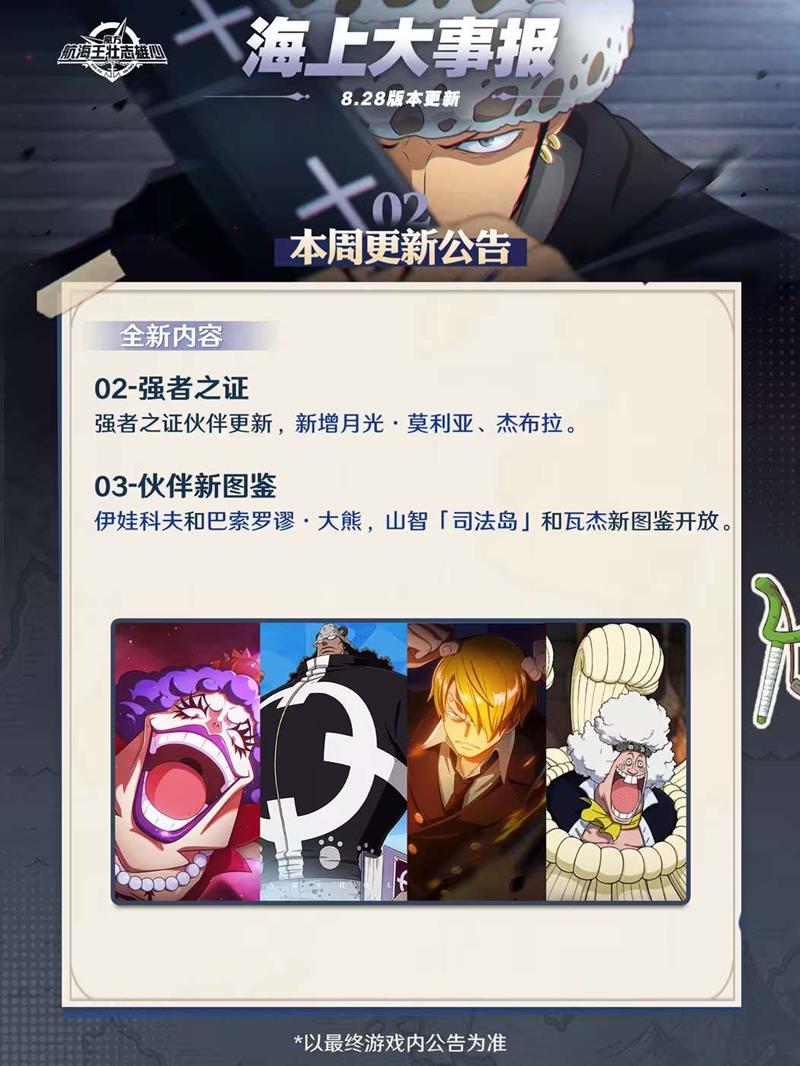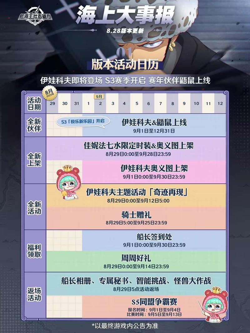 航海王壮志雄心S3特典伙伴伊娃科夫以及他的奥义图将在9月1日正式上线。同时,S3赛年伙伴鼯鼠也将在同一天与大家见面,随着伊娃科夫的上线,游戏将开启主题活动「奇迹再现」。玩家们可以通过参与活动获取丰富的福利和好礼,体验伊娃科夫带来的“奇迹”力量。