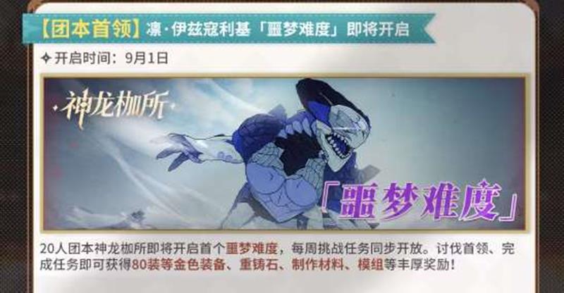 团本首领:凛·伊兹寇利基「噩梦难度」即将开启,挑战更高难度,赢取丰厚奖励。