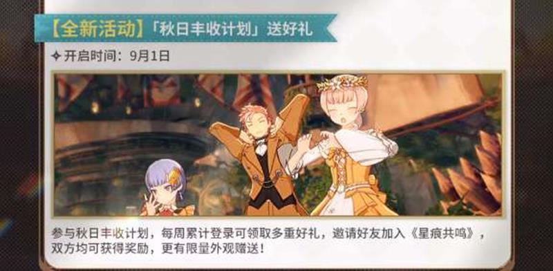 秋日丰收计划:全新活动「秋日丰收计划」送好礼,参与活动可领取多重好礼,邀请好友加入《星痕共鸣》,双方均可获得奖励,更有限量外观赠送。